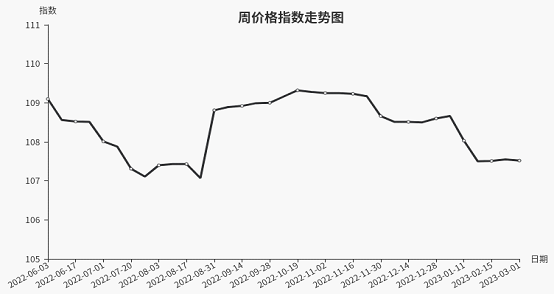 据临沂商城价格指数信息系统监测,本周临沂商城周价格总指数为107.52点,环比下跌0.03点,跌幅0.03%。