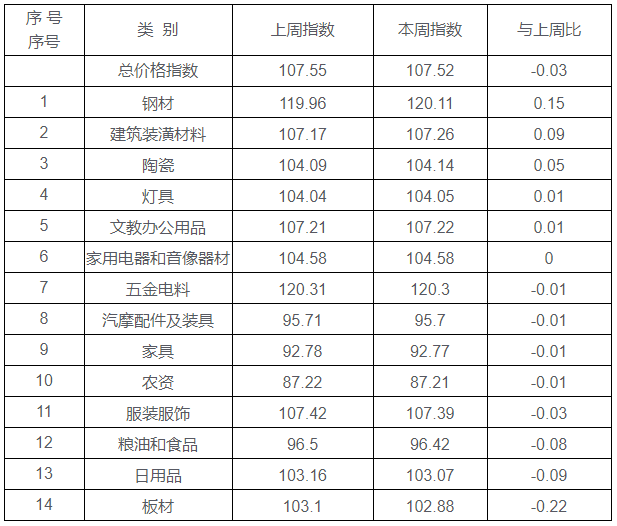 在14类商品价格指数中,上涨的5类、持平的1类、下跌的8类。其中,涨幅前3位的是:钢材类、建筑装潢材料类、陶瓷类,分别上涨0.15、0.09、0.05点;跌幅前3位的是:板材类、日用品类、粮油和食品类,分别下跌0.22、0.09、0.08点;灯具类、文教办公用品类、家用电器和音像器材类、五金电料类、汽摩配件及装具类、家具类、农资类、服装服饰类等8大类价格指数波动较小或持平。