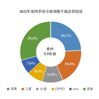 据相关机构统计,2022年第四季度全球智能手机出货量为3.0亿台,同比下降18.3%,出货量前五家企业市场占有率总和为70.6%。其中,小米出货量为3320万台,同比下降26.3%,市场占有率为11.0%;OPPO出货量为2530万台,同比下降15.9%,市场占有率为8.4%;vivo出货量为2290万台,同比下降18.9%,市场占有率为7.6%。