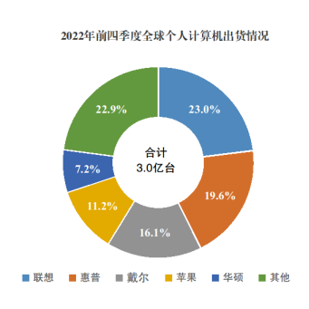 据相关机构统计,2022年第四季度全球个人计算机出货量为6720万台,同比下降28.1%,出货量前五家企业市场占有率总和为77.1%。其中,联想出货量为1550万台,同比下降28.5%,市场占有率为23.0%;华硕出货量为480万台,同比下降20.9%,市场占有率为7.2%。