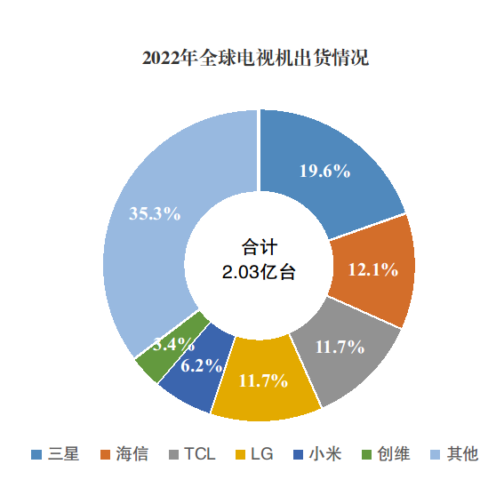 据相关机构统计,2022年全球电视机出货量为2.03亿台,同比下降4.8%,出货量前六家企业市场占有率总和为64.7%。其中,海信出货量为2454.3万台,同比增长16.1%,市场占有率为12.1%;TCL出货量为2378.6万台,同比下降3.2%,市场占有率为11.7%;小米出货量为1260.1万台,同比下降2.7%,市场占有率为6.2%;创维出货量为696.9万台,同比增长3.4%,市场占有率为3.4%。