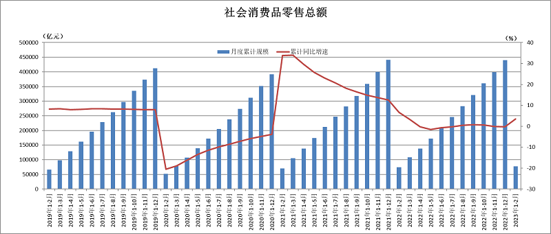 1—2月份,社会消费品零售总额77067亿元,同比增长3.5%。其中,除汽车以外的消费品零售额70409亿元,增长5.0%。按经营单位所在地分,1—2月份城镇消费品零售额66796亿元,同比增长3.4%;乡村消费品零售额10271亿元,增长4.5%。按消费类型分,1—2月份商品零售68638亿元,同比增长2.9%;餐饮收入8429亿元,增长9.2%。1—2月份全国网上零售额20544亿元,同比增长6.2%。