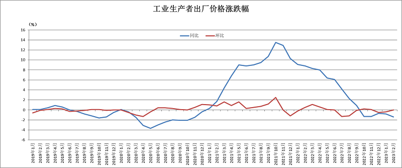 2023年2月份,全国工业生产者出厂价格同比下降1.4%,环比持平。从环比看,生产资料价格上涨0.1%,影响工业生产者出厂价格总水平上涨约0.06个百分点;生活资料价格下降0.3%,影响工业生产者出厂价格总水平下降约0.08个百分点。从同比看,生产资料价格下降2.0%,影响工业生产者出厂价格总水平下降约1.61个百分点;生活资料价格上涨1.1%,影响工业生产者出厂价格总水平上涨约0.25个百分点。1—2月,工业生产者出厂价格比去年同期下降1.1%。