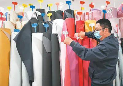 晋江国际鞋纺城是传统鞋纺产业基地福建省晋江市最大的鞋材交易市场。目前,该鞋纺城采购贸易日均出口额约4825万元。图为日前在晋江国际鞋纺城,一家鞋材企业的销售人员在裁剪制鞋面料。周义 摄(新华社发)