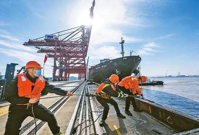 农历新年伊始,众多行业迅速投入生产,为经济运行持续攀升,实现开门稳、开门好、开门红、开门旺奠定坚实基础。图为2023年1月31日,在宁波舟山港金塘港区大浦口集装箱码头上,工作人员合力拉缆绳,帮助一艘外籍货轮靠泊。新华社记者 徐昱/摄