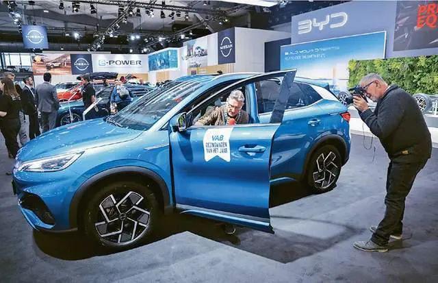2023年1月13日,第100届比利时布鲁塞尔车展迎来媒体开放日,这是该展览疫情后首次线下举办。比亚迪、上汽、北汽、东风小康、赛力斯等中国品牌携高端车型登陆车展,其中多款电动汽车备受瞩目。图为记者在比利时布鲁塞尔车展媒体开放日上报道比亚迪Atto3电动汽车。新华社记者 郑焕松/摄