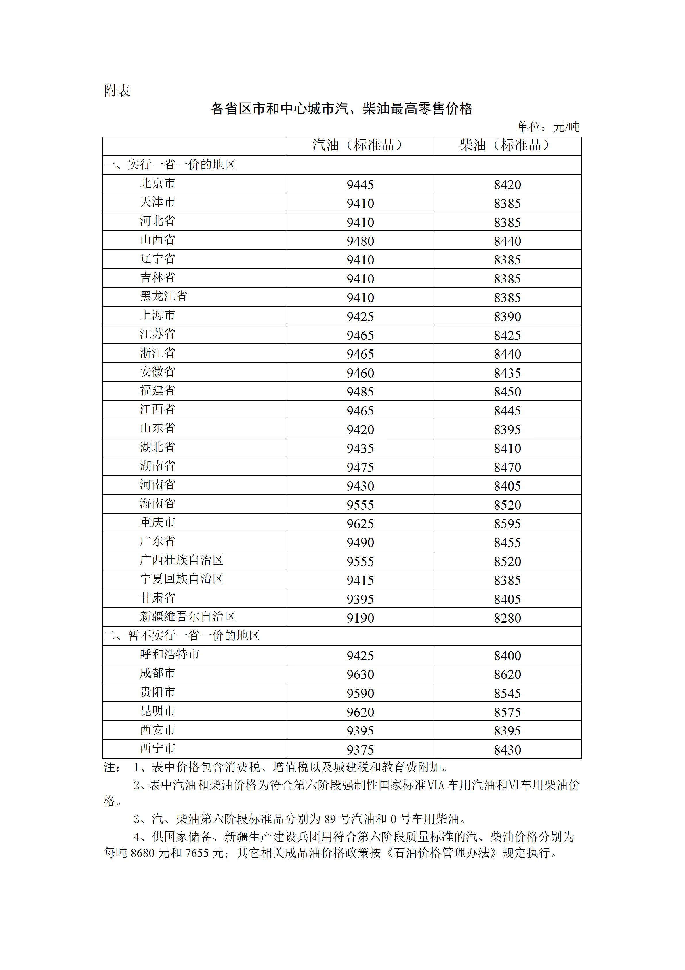 附:各省区市和中心城市汽、柴油最高零售价格