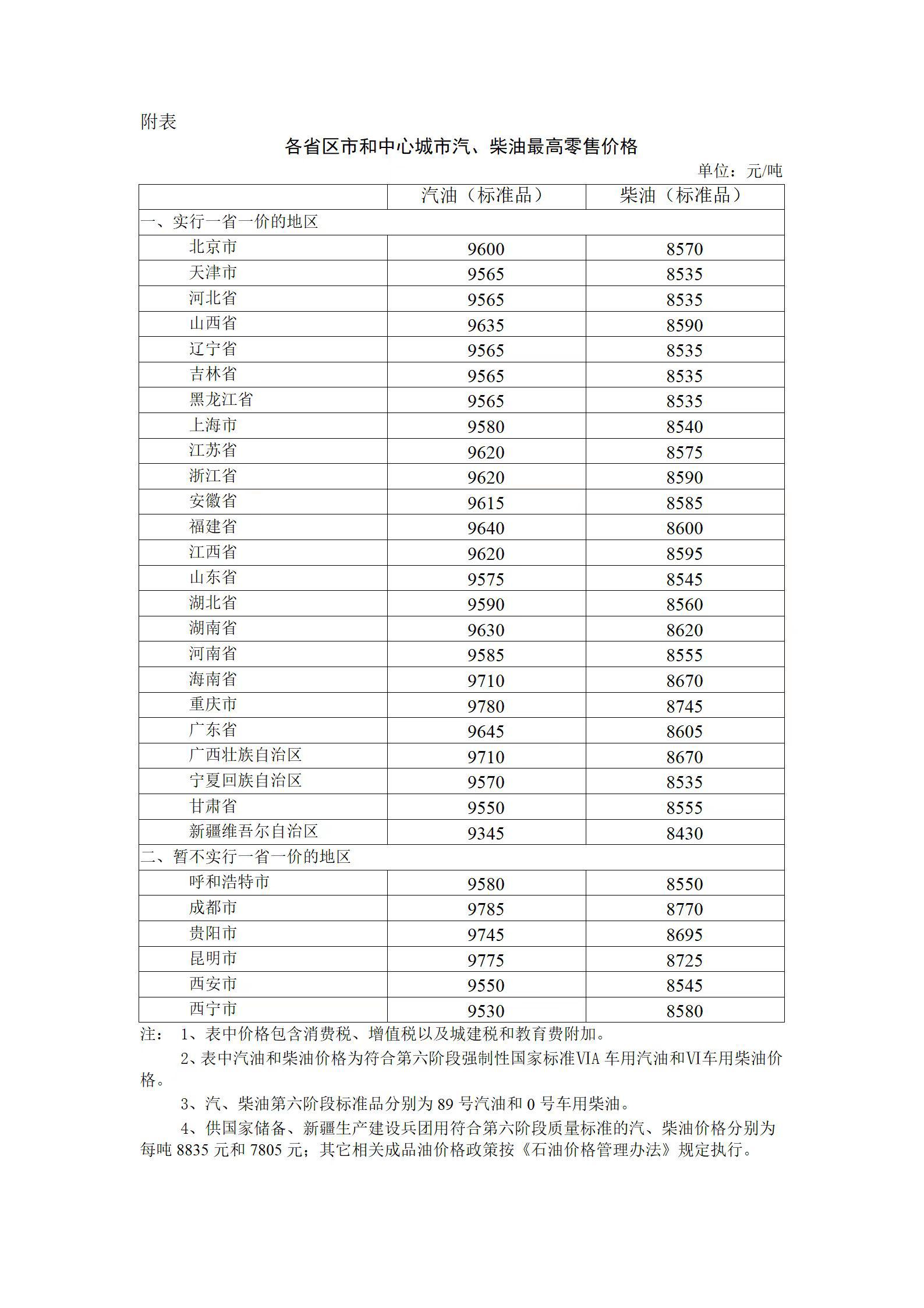 根据近期国际市场油价变化情况,按照现行成品油价格形成机制,自2023年3月17日24时起,国内汽、柴油价格(标准品,下同)每吨分别降低100元和95元。调整后,各省(区、市)和中心城市汽、柴油最高零售价格见附表。相关价格联动及补贴政策按现行规定执行。