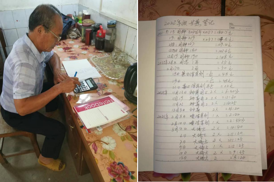 施光权是青秀区南阳镇甘蔗农本调查户,参与农本调查33年。他的工作体会一是准确掌握农产品产量产值和价格数据,二是记录生产投入和用工时间的数据要及时。多年以来,政府持续出台了让农民有稳定盈利的甘蔗收购政策,激发了农民种植甘蔗的积极性。他表示,十分热爱这项利国利民的工作,他的身体依然硬朗,一定会坚持认真做好这项工作,为助力乡村振兴贡献一份力量。