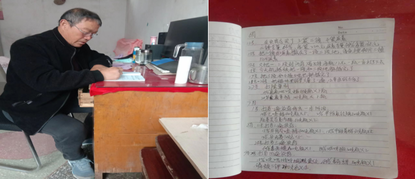 “6月12号,在农资店买了3袋二胺,4袋尿素。二胺含量64%,每袋220元,尿素含量46%,每袋165元;6月13号,把二胺和尿素洒在了一段二段地,每亩按40斤二胺50斤尿素……”在徐州市沛县农调户刘瑞海的日记本上,工工整整地记录着他从事13年农本调查工作的点点滴滴,朴实无华的文字映现出这位老农民细致入微的工作态度。他常对大家说,我要坚持一笔一笔记录好这些数据,完成好调查任务,努力陪伴农本调查走过下一个十年。