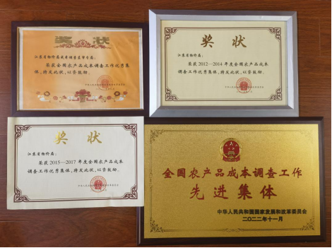 在全体农调工作人员和调查户的共同努力下,江苏省连续多次获得全国农产品成本调查“先进集体”称号。
