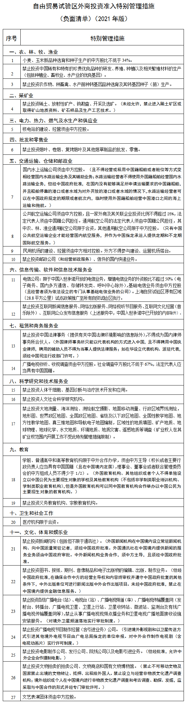 一、《自由贸易试验区外商投资准入特别管理措施(负面清单)》(以下简称《自贸试验区负面清单》)统一列出股权要求、高管要求等外商投资准入方面的特别管理措施,适用于自由贸易试验区。《自贸试验区负面清单》之外的领域,按照内外资一致原则实施管理。境内外投资者统一适用《市场准入负面清单》的有关规定。